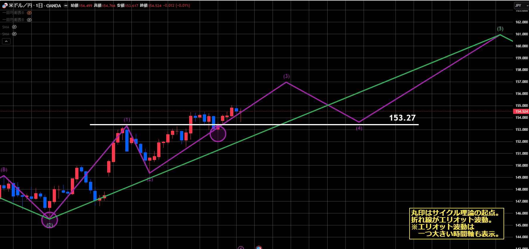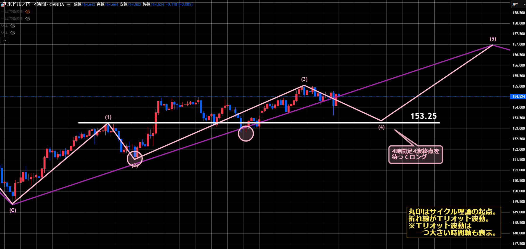 日足のエリオット波動を3波インパルスで想定しているので、4時間足の4波は1波終点153.25を割り込まない想定で見ています。