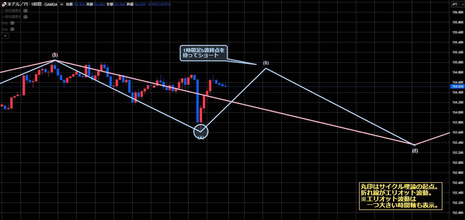ただ注意点として、メジャーサイクルと、4Hサイクルは金曜日につけた安値153.61が起点で新サイクルがスタートしてるかもしれません。