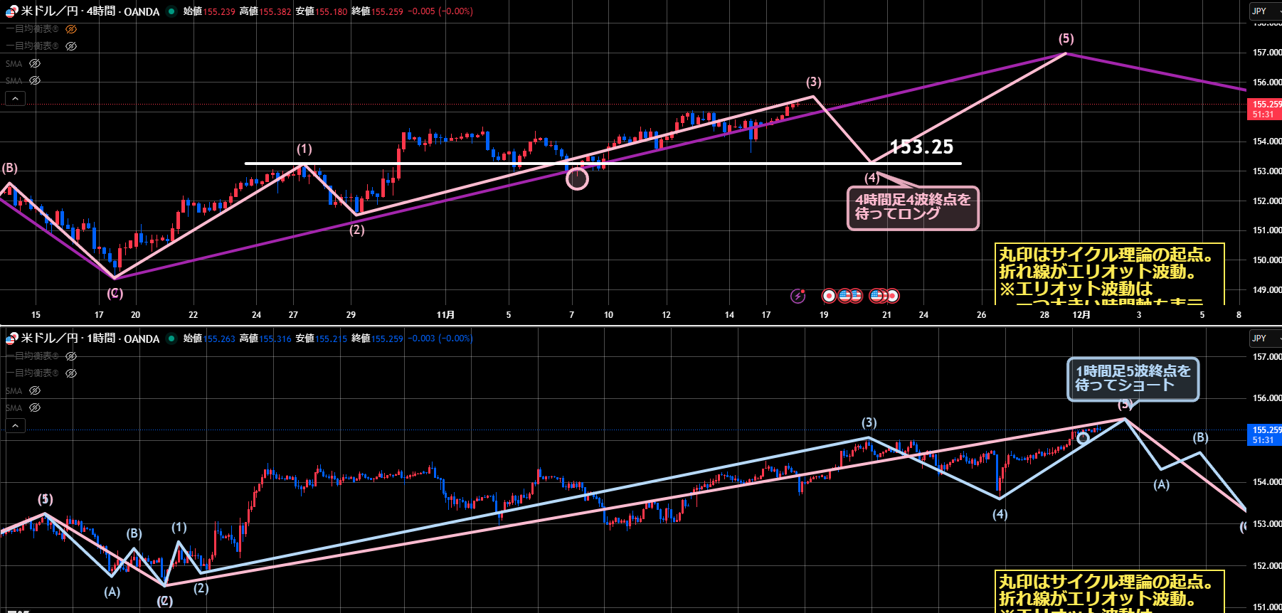 エントリーポイントは、4Hサイクルはサイクル天井からショート、4時間足のエリオット波動は3波終点からショートと言いたいところですが、これらは逆張りや修正波になって難易度が高めなので、小さめのロッドやポジション保有時間が短めが推奨になります。