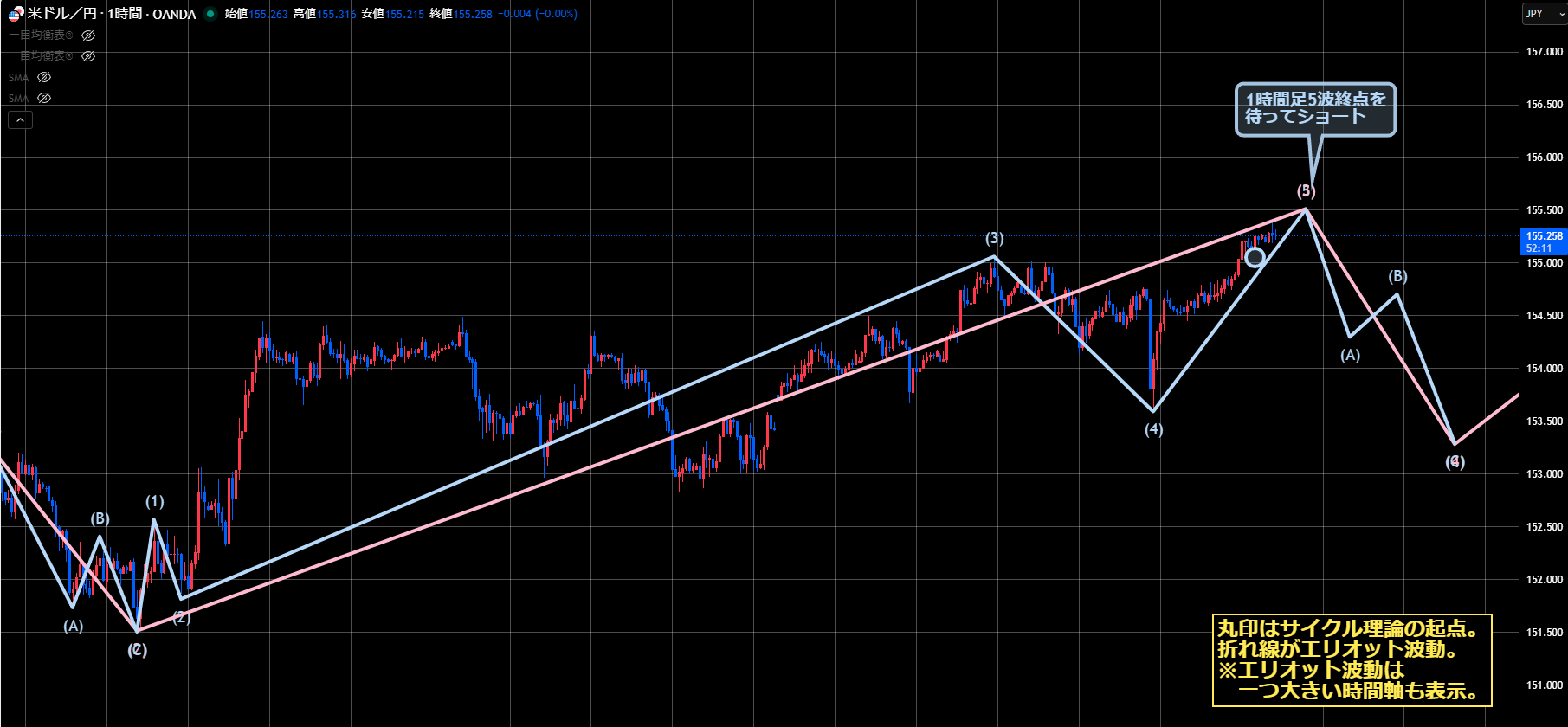 1時間足レベルで見ると、エリオット波動は5波終点を待ってショートになりますが、こちらも結局1つ大きい4時間足が修正波になりますので、難易度は高めになります。