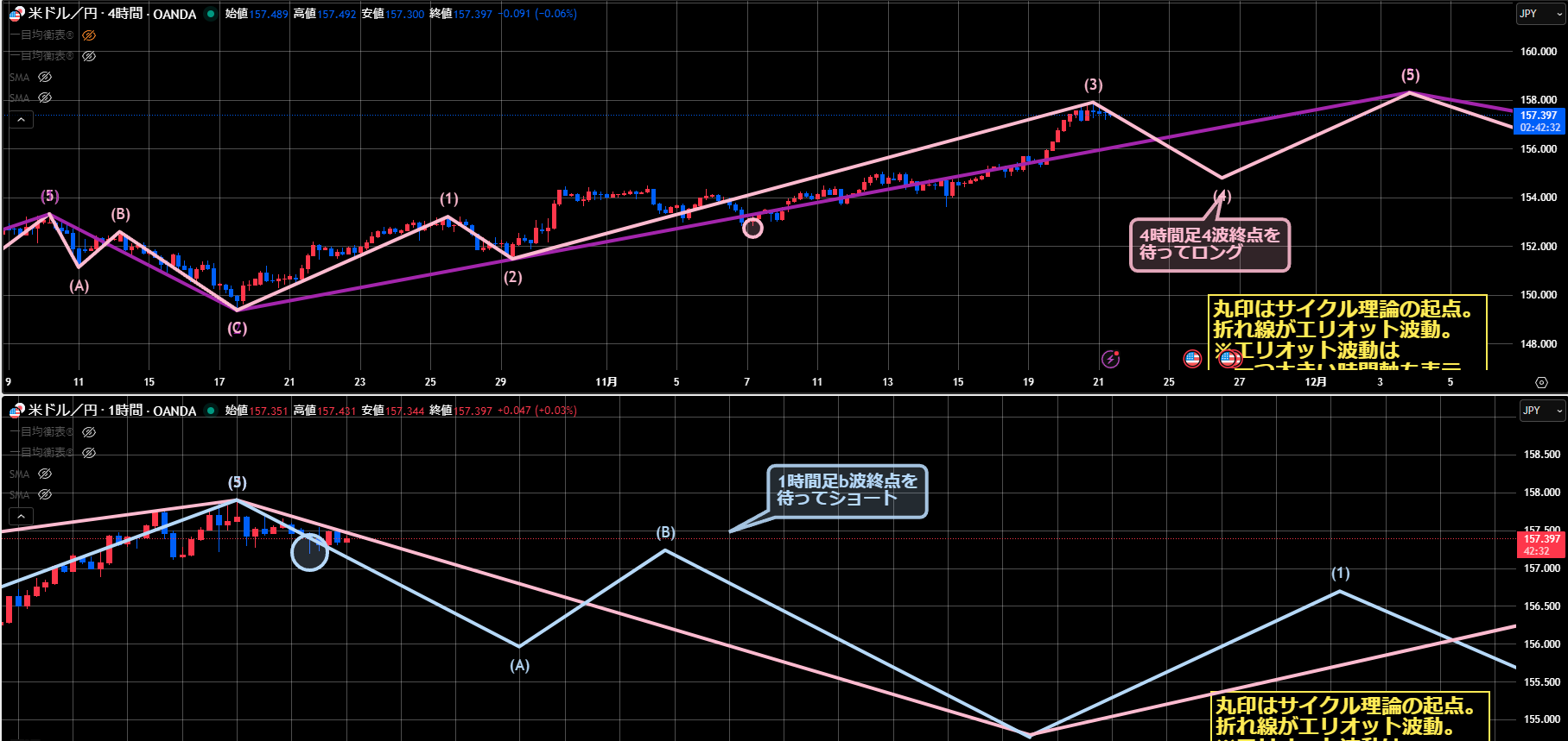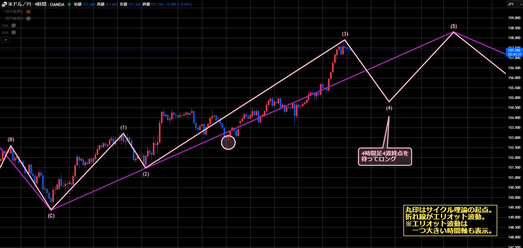 今回の4Hサイクルボトムは、エリオット波動4波終点と重なるタイミングで見ています。