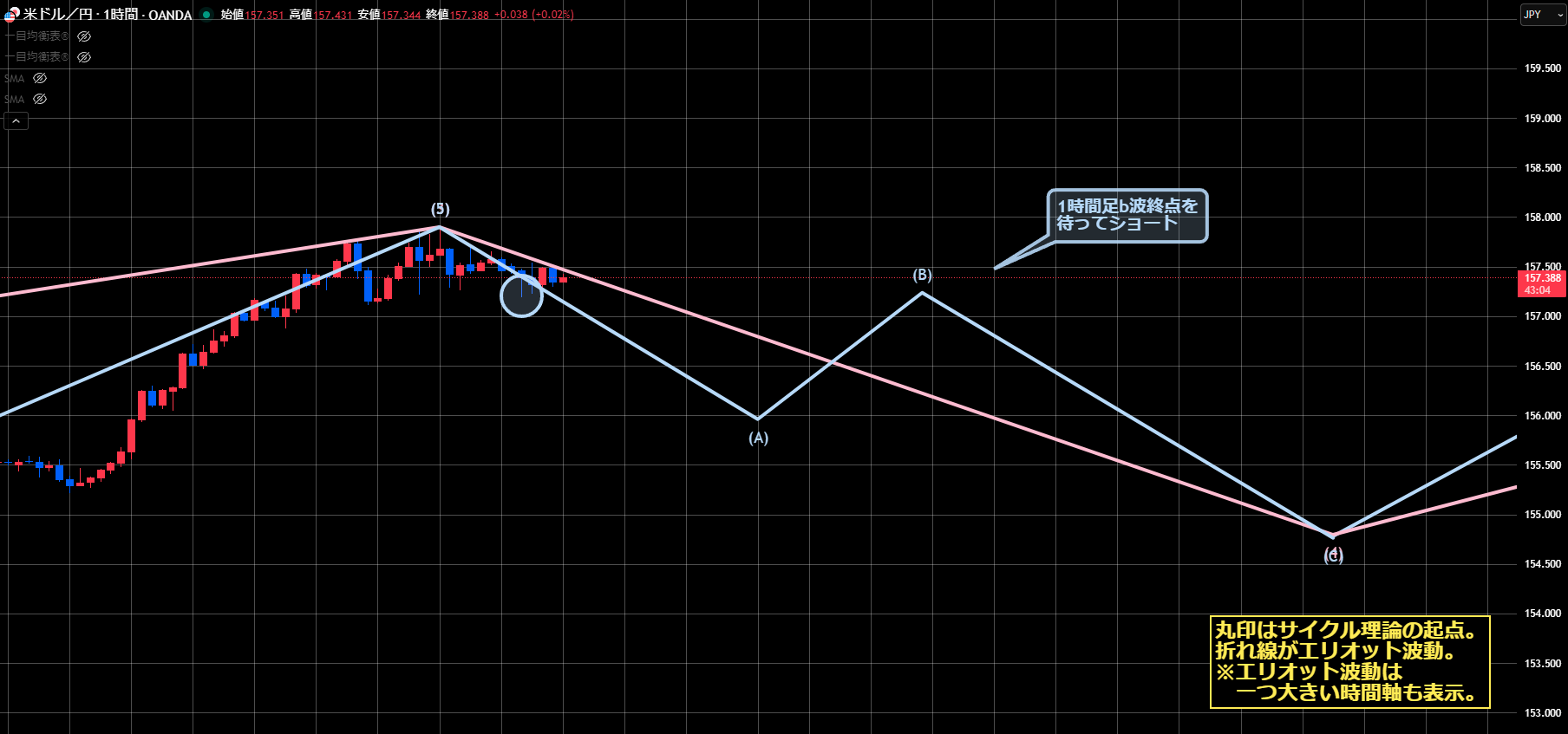 1時間足レベルでは、エリオット波動b波終点を待ってショートになります。