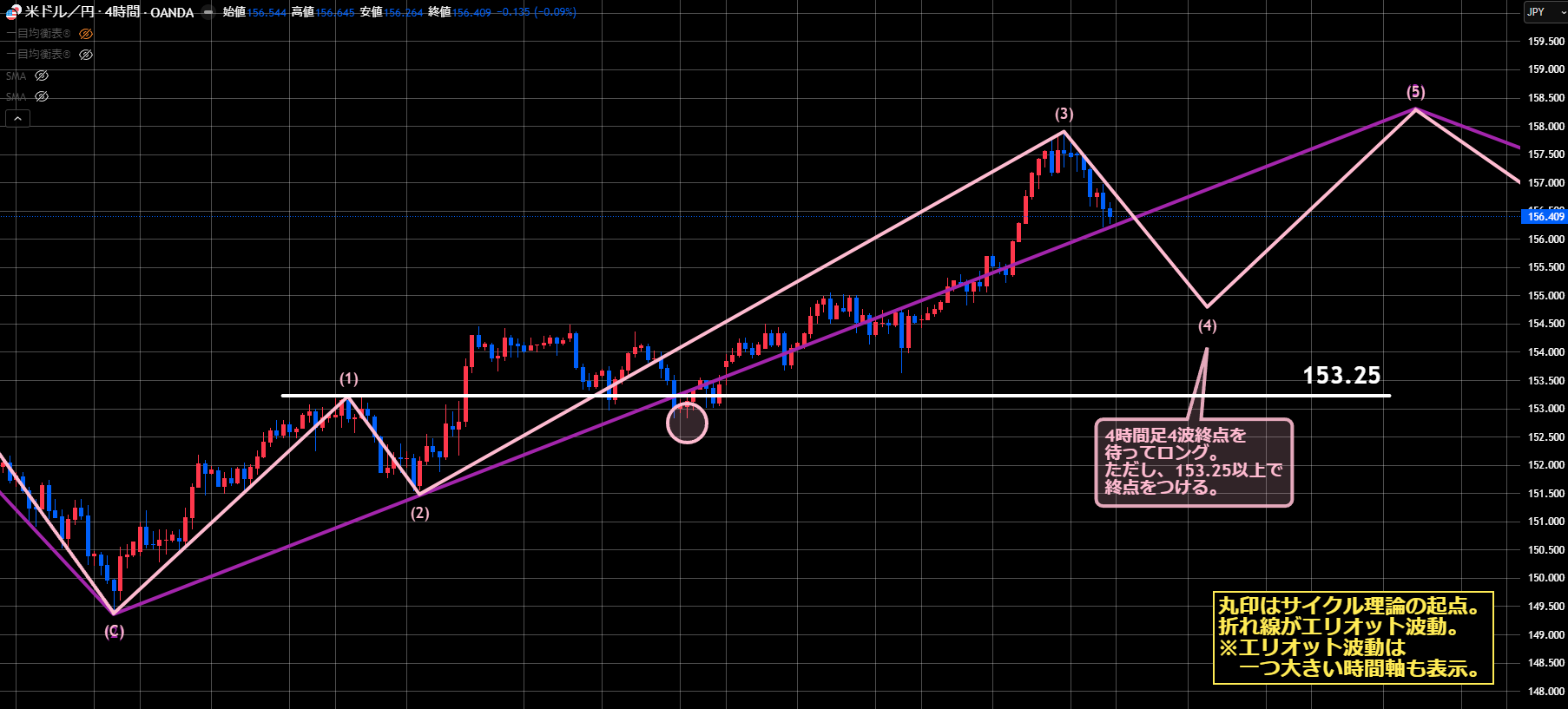 4Hサイクルは天井をつけて、4時間足のエリオット波動は3波が終点をつけて4波に入ったと見ています。