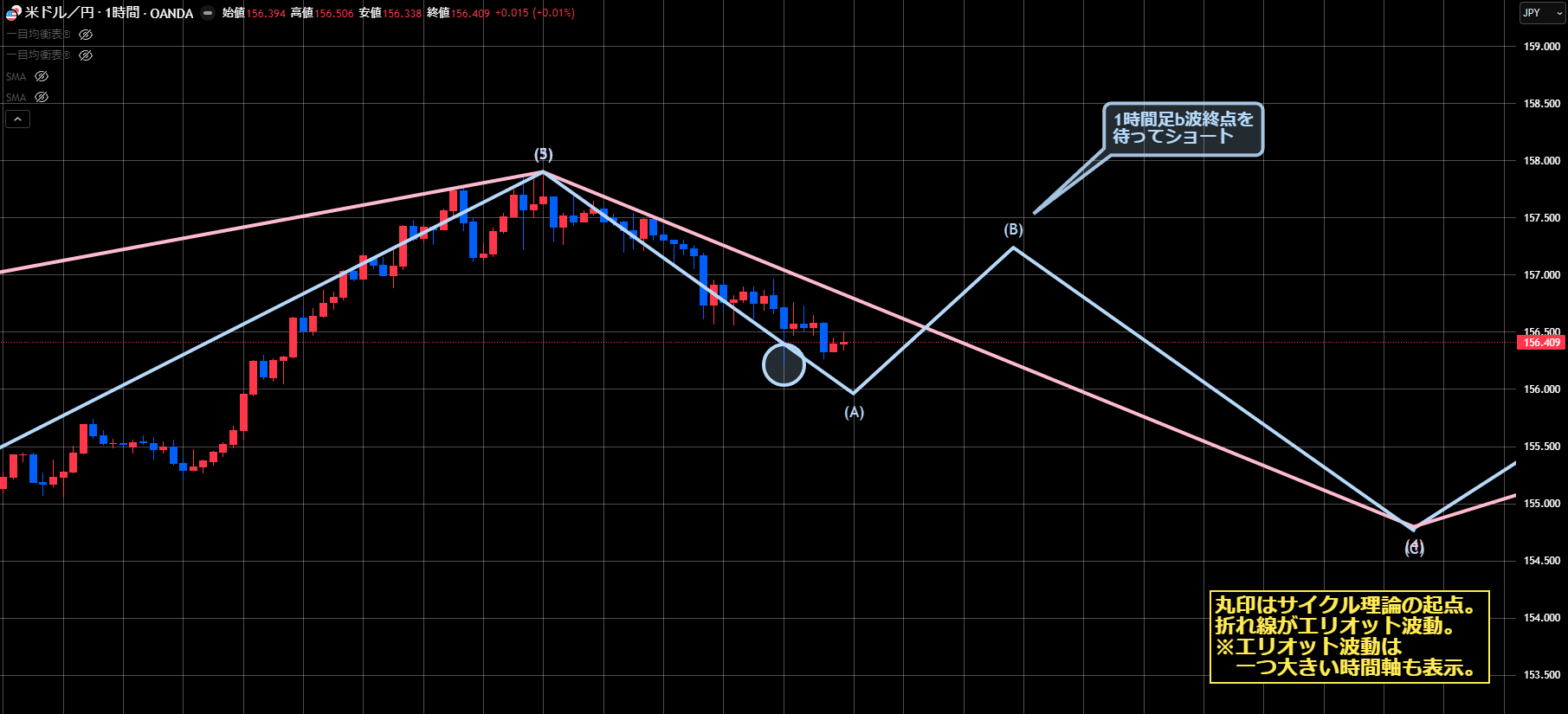 次のエントリーポイントは、4Hサイクルボトム、4時間足エリオット波動4波終点、1時間足はb波終点を待ってショートになります。