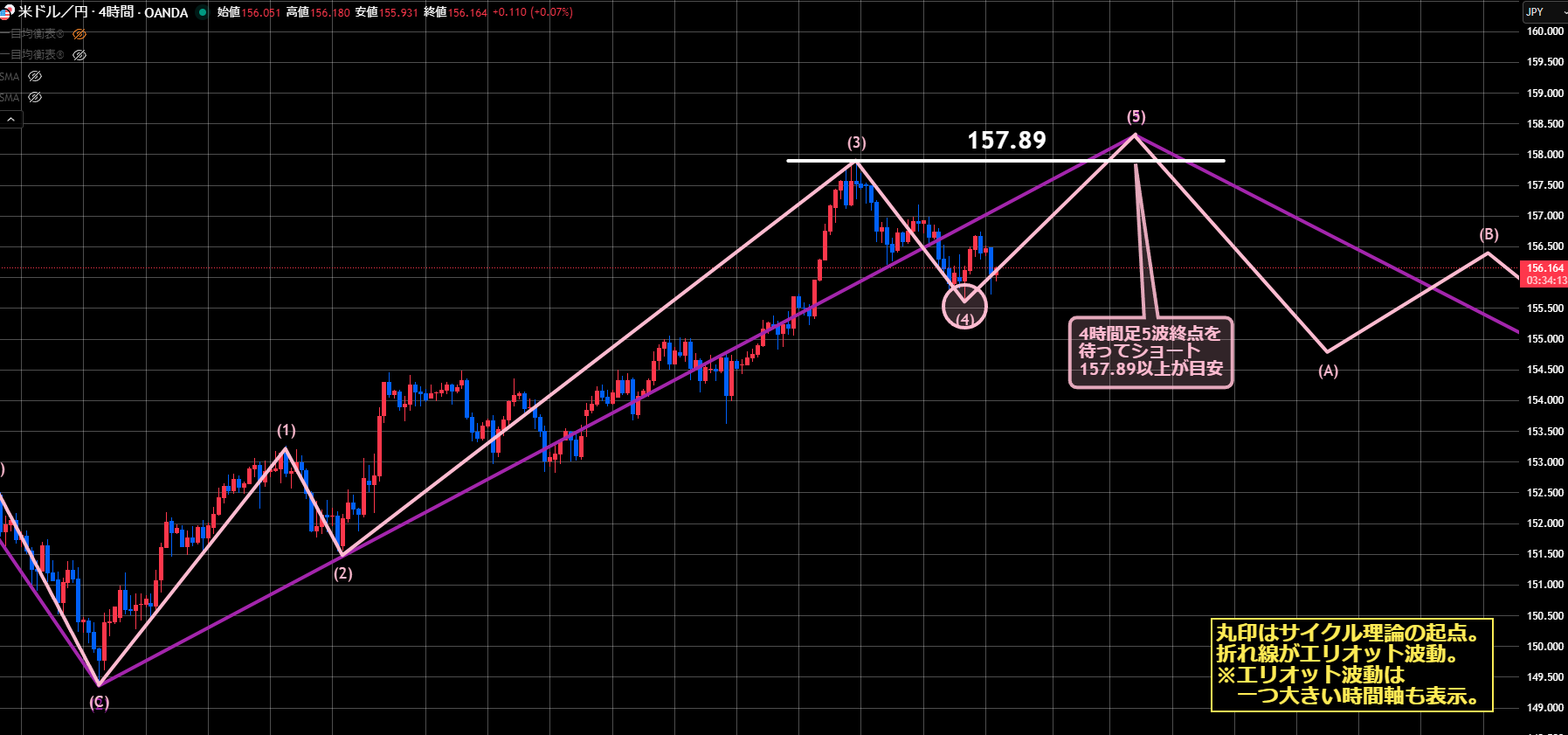 ただし直近で155.65付近まで下落しているのでここを割ってきた場合、4Hサイクルもエリオット波動4波も継続になります。