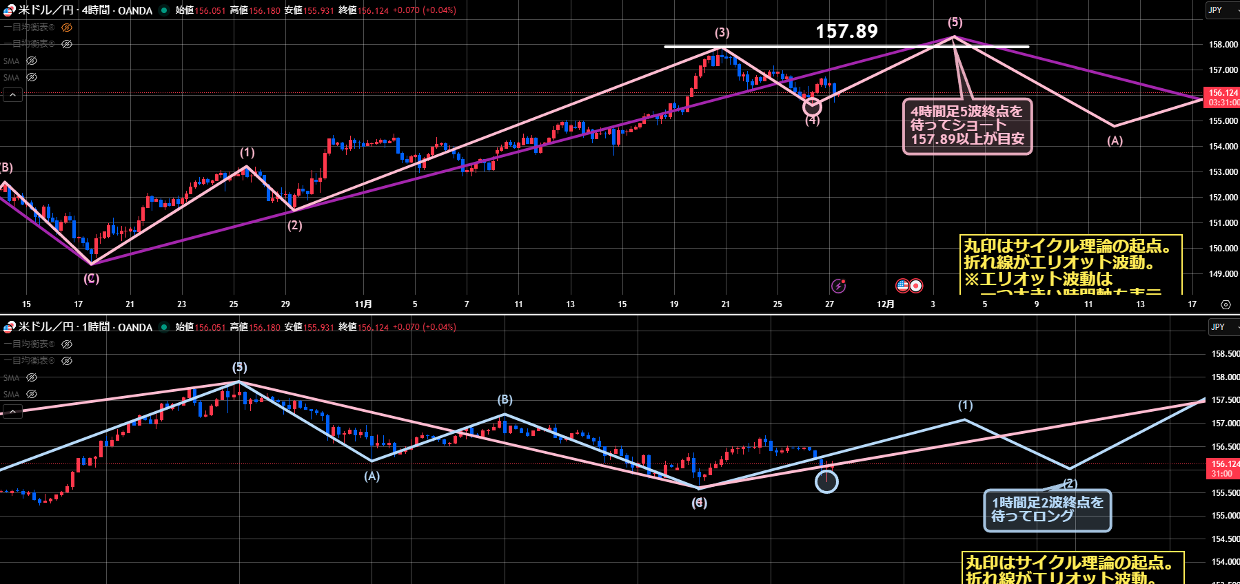 また今回の4Hサイクルの天井と、4時間足エリオットの5波終点は重なるタイミングで見ているので、4Hサイクル天井も157.89が目安になります。