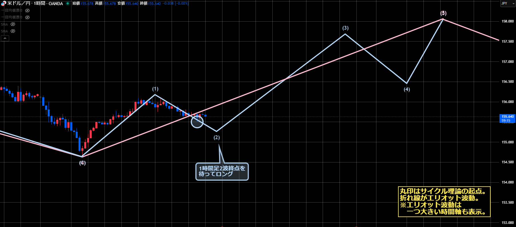 4Hサイクルは新サイクルスタートで見ていますが、このまま下落しても154.66の起点を割らないなら押し目買いのチャンスにつながりますので焦らず見ていこうと思います。
