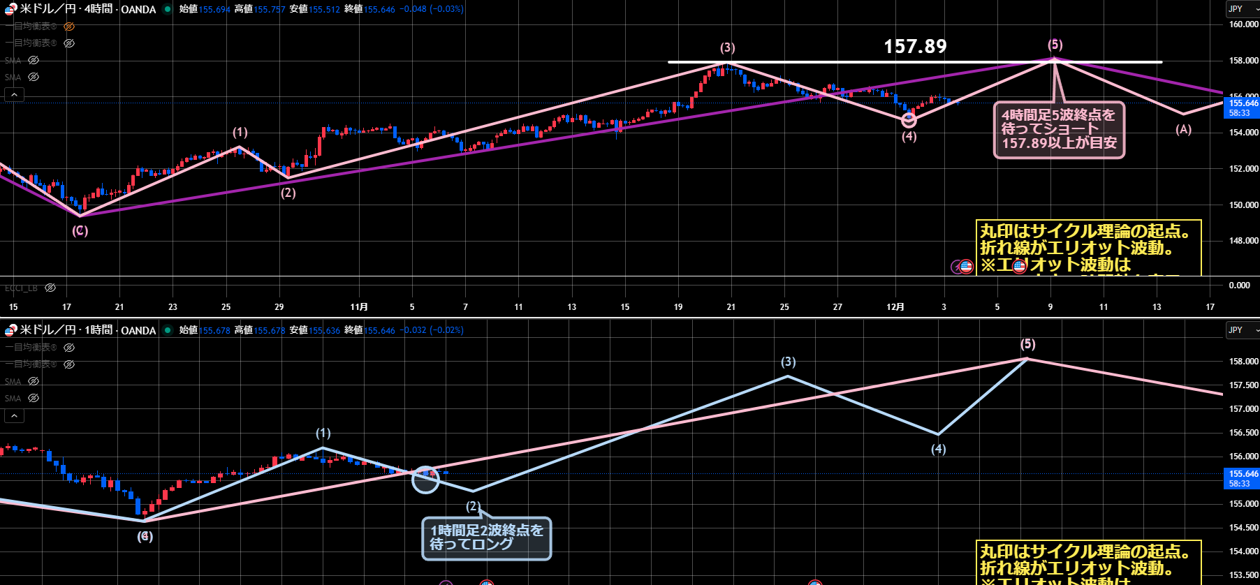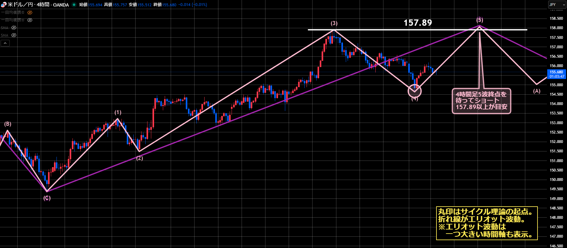 4時間足レベルでは、サイクル理論は4Hサイクル天井、エリオット波動は5波終点を待ってショートになります。