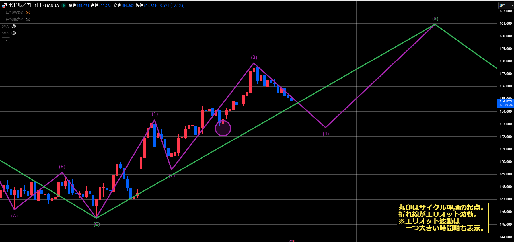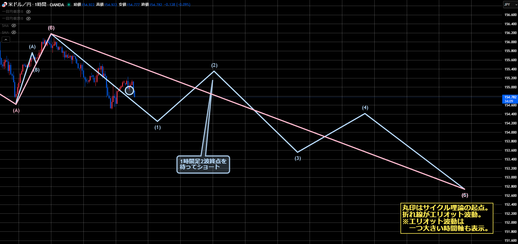 1時間足レベルでは、売り目線なのでサイクル理論はサイクル天井からショート、エリオット波動は2波終点を待ってショートになります。