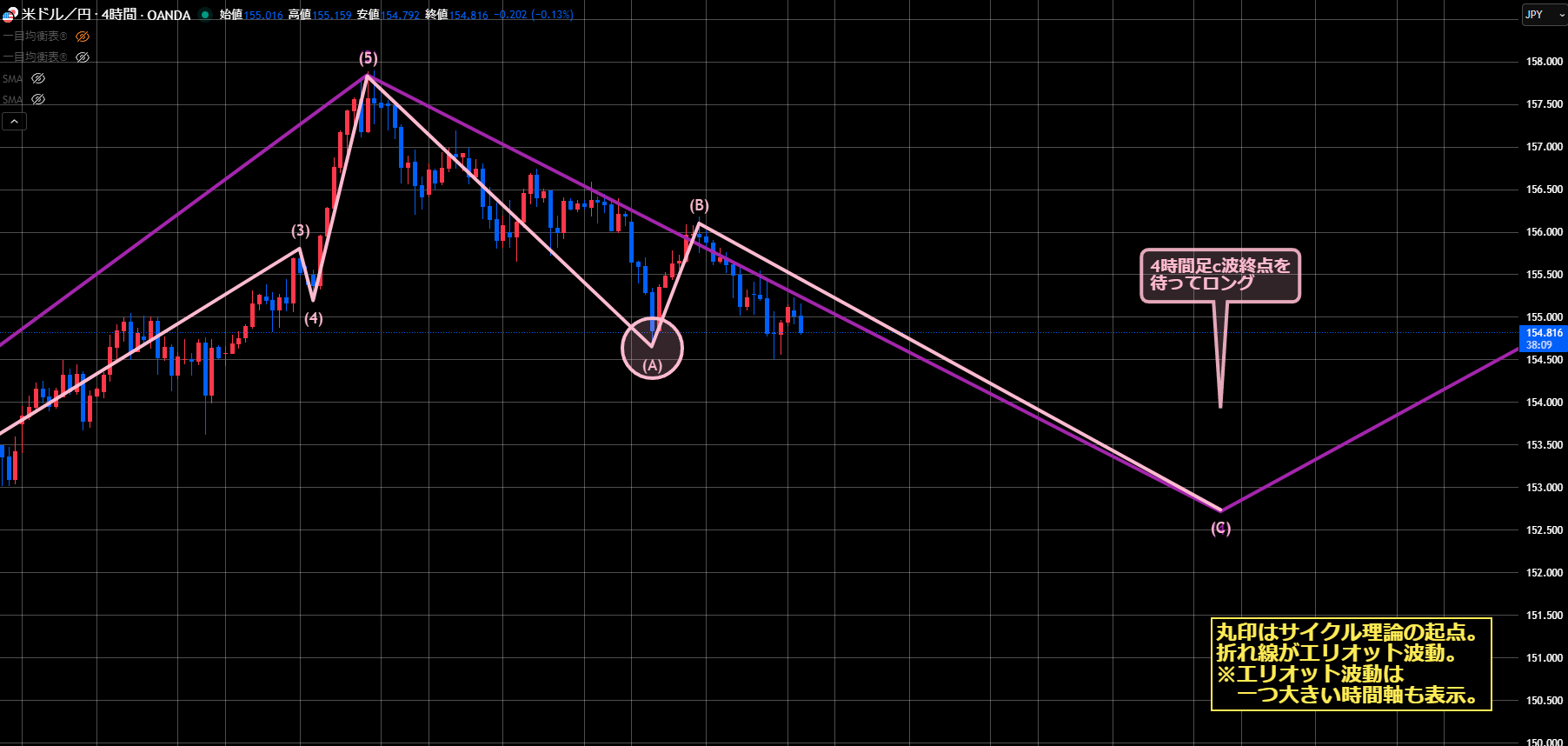 4時間足のエリオット波動を単体で見ると、次のエントリーポイントはc波終点を待ってロングになります。