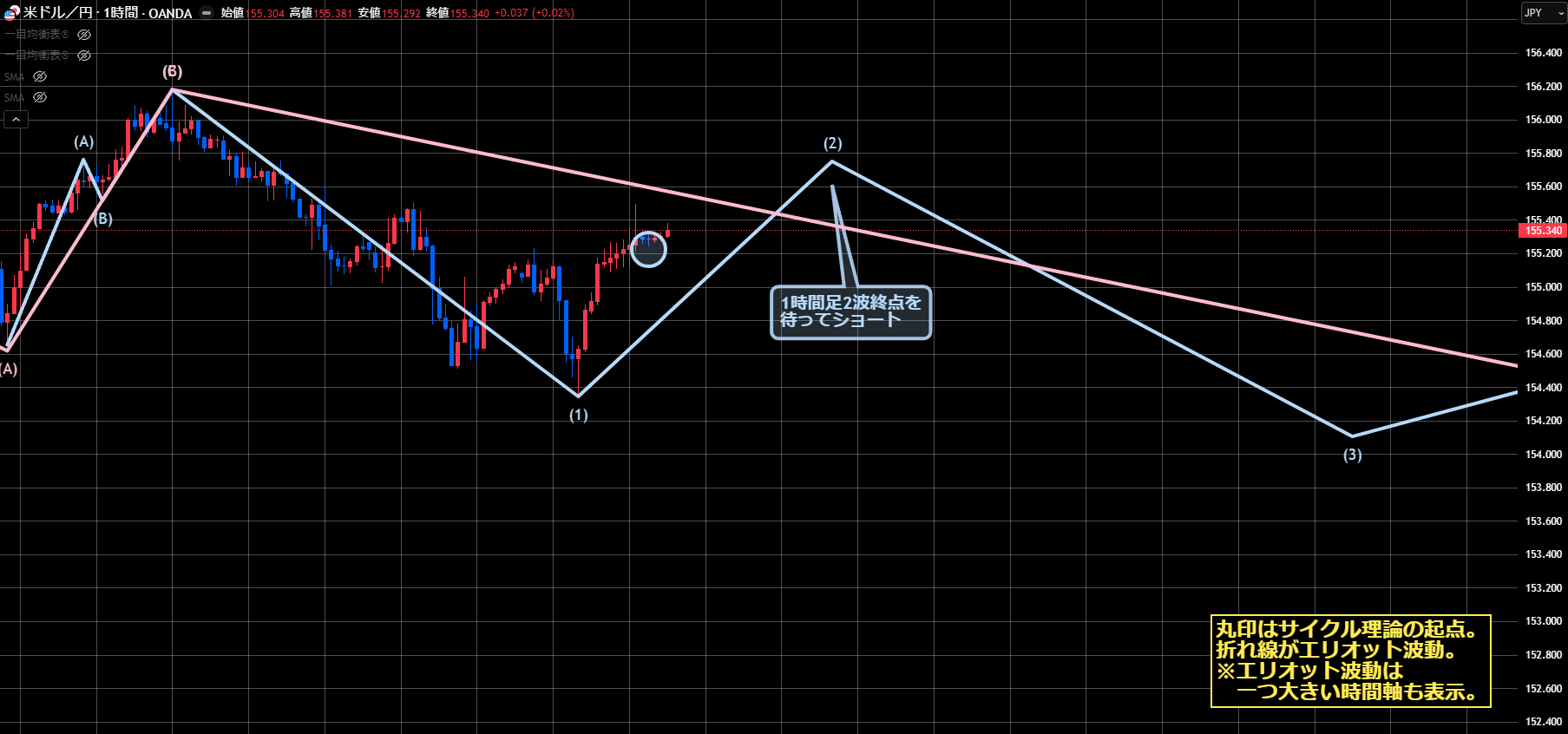 1時間足のエリオット波動では、2波終点を待ってショートとなります。