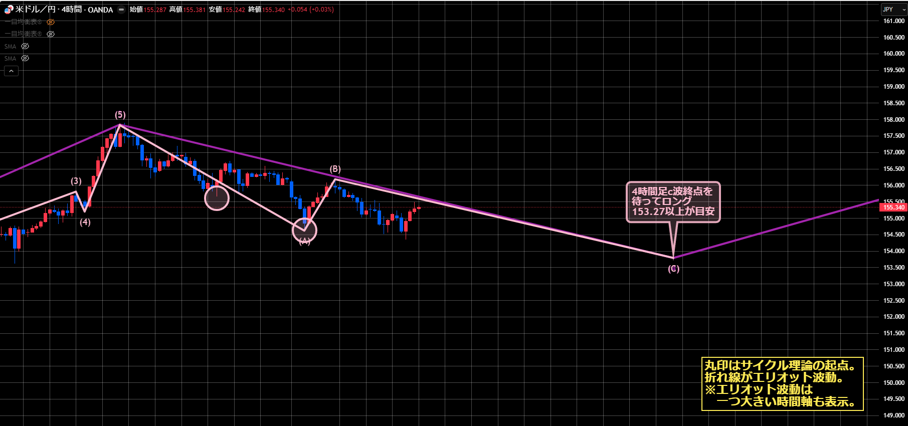 日足の4波終点が4時間足のc波終点に当たりますので、必然的にc波終点も153.27以上が目安になります。