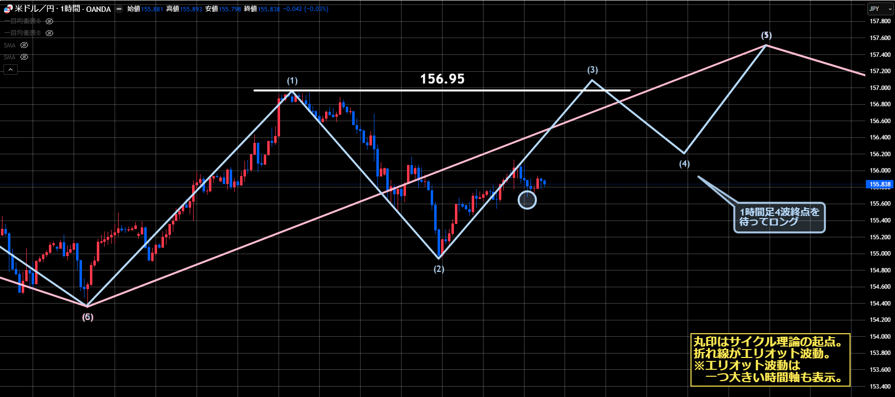 1時間足レベルで見るとエリオット波動は4波終点を待ってロングになります。
