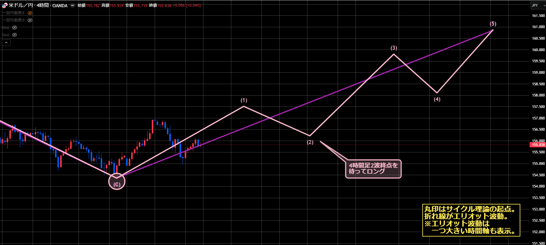 ただし4Hサイクル天井からのショートは逆張りになりますし、エリオット波動で見ると修正2波なので難易度は高めになります。
