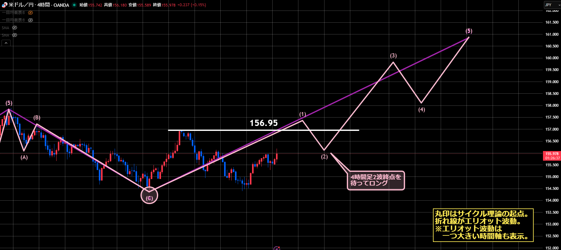 なので、直近高値156.95超えで4Hサイクル天井をつけることになります。