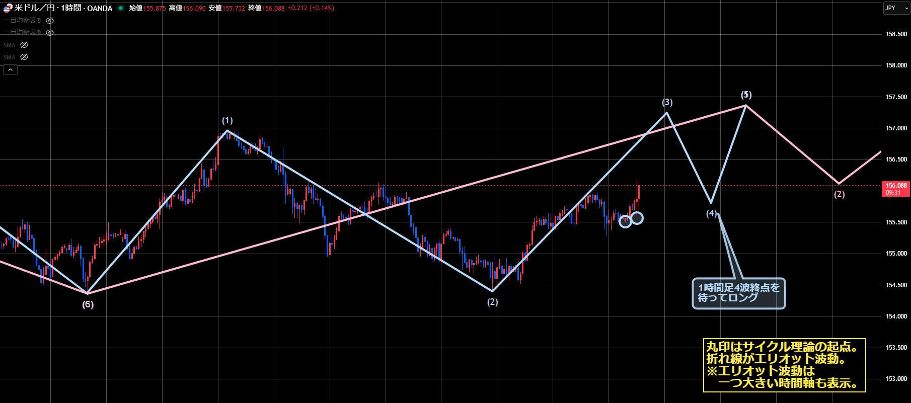 エントリーポイントとしては、1時間足4波終点を待ってロングになります。