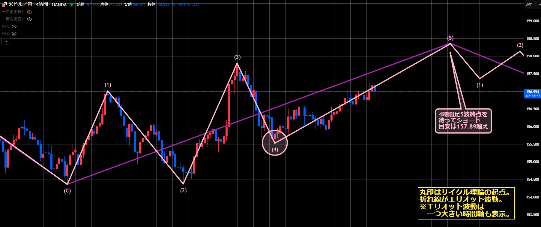 4時間足レベルで見ると、サイクル理論は4HC天井、エリオット波動は5波終点を待ってショートになります。