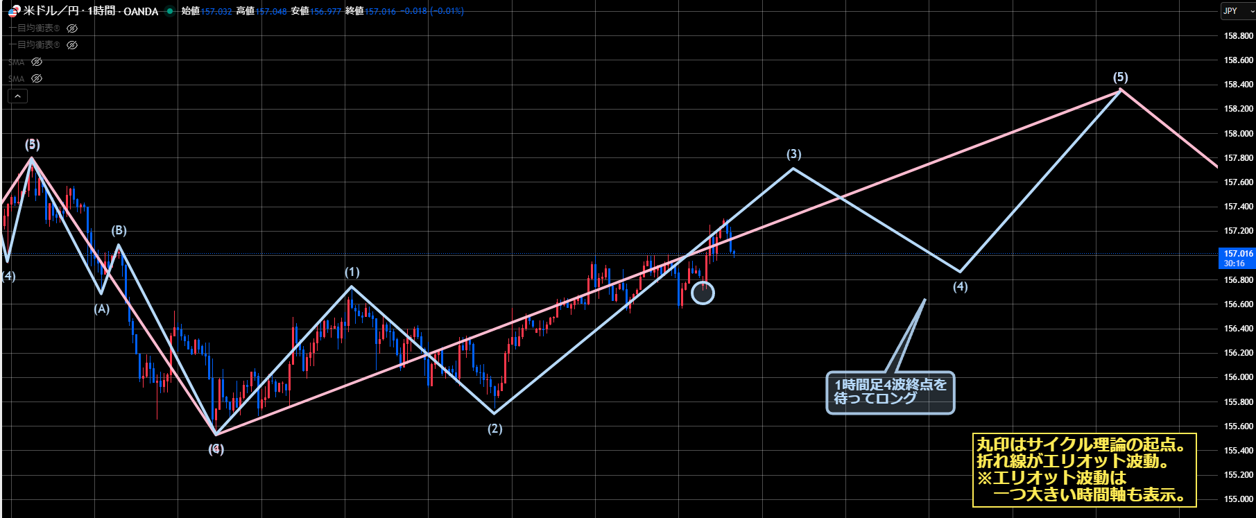 4Hサイクル天井と5波終点までのロングを狙うのであれば、1時間足のエリオット波動を活用することになります。