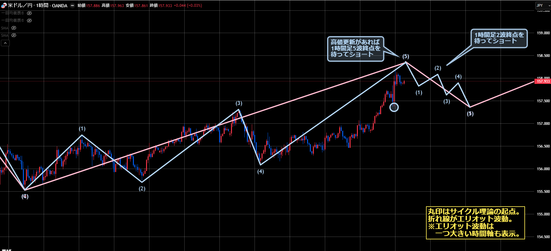 この場合、サイクル理論は逆張りになりますし、エリオット波動は2波で修正波となって難易度が高いので非推奨です。