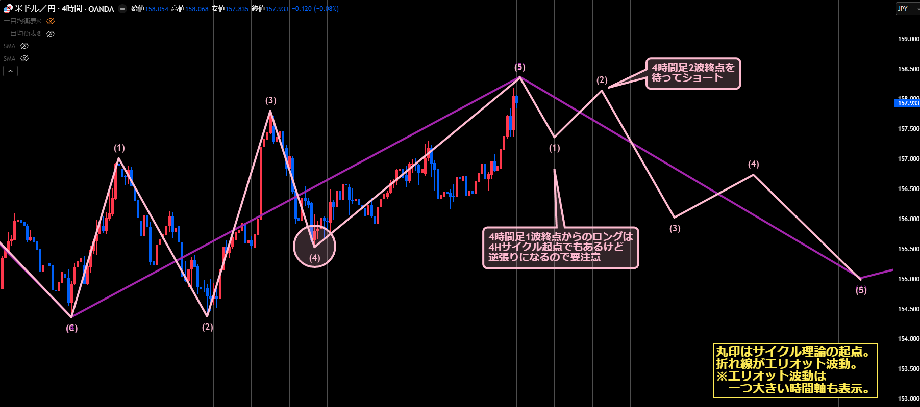 ただし4時間足と1時間足のエリオット波動が、まだ5波継続中なのか1波に切り替わったのか、判断が難しい状況になっています。
