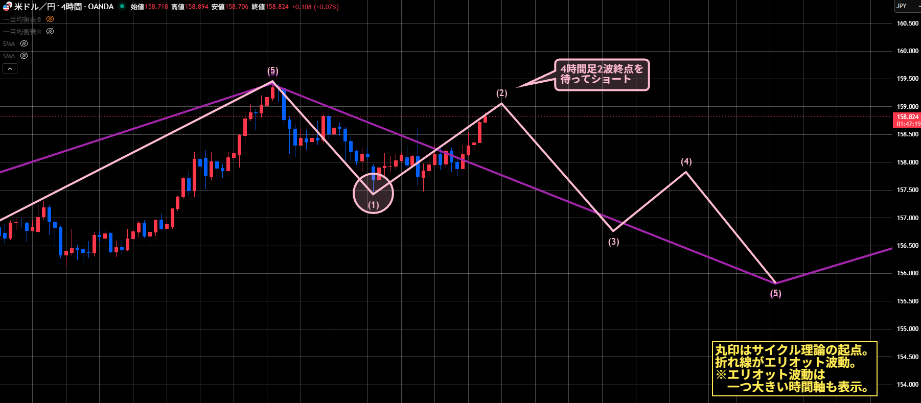 なので、上値のポイントを159.45に置きつつ、4Hサイクルの天井、エリオット波動の2波終点を待つことになります。