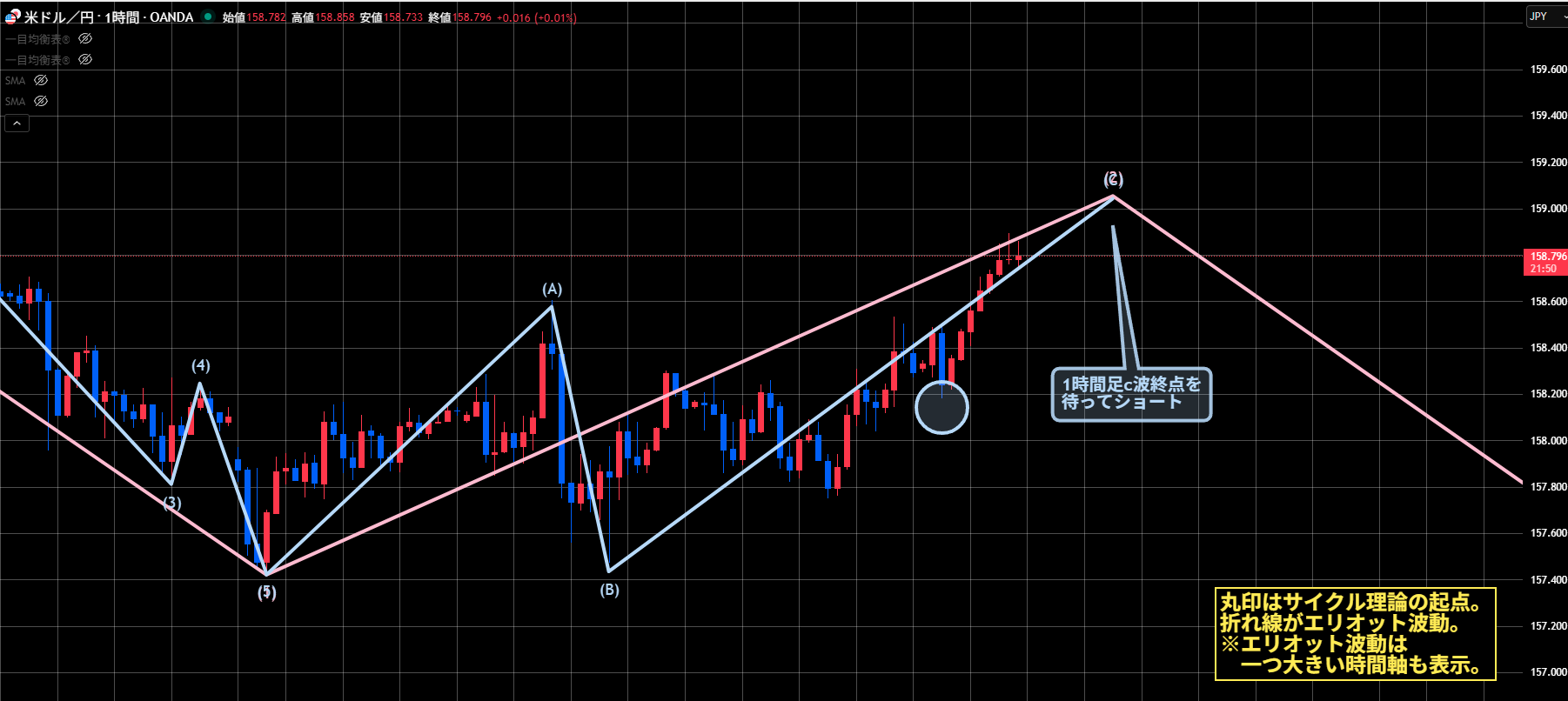 今日のお昼頃から強い上昇が続いて、1時間足のエリオット波動a波終点158.60を超えたので、c波終点をいつつけてもおかしくない状況になりました。