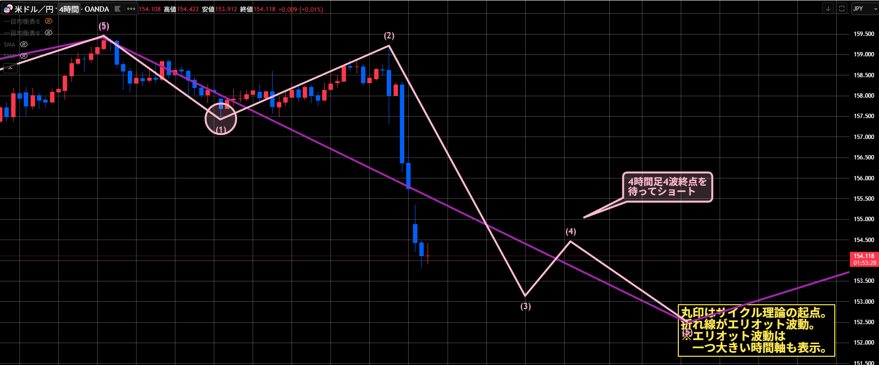 この後の値動きで、1波終点で想定している153.81を割ってきたら、少しカウントを見直す必要があるかもしれません。