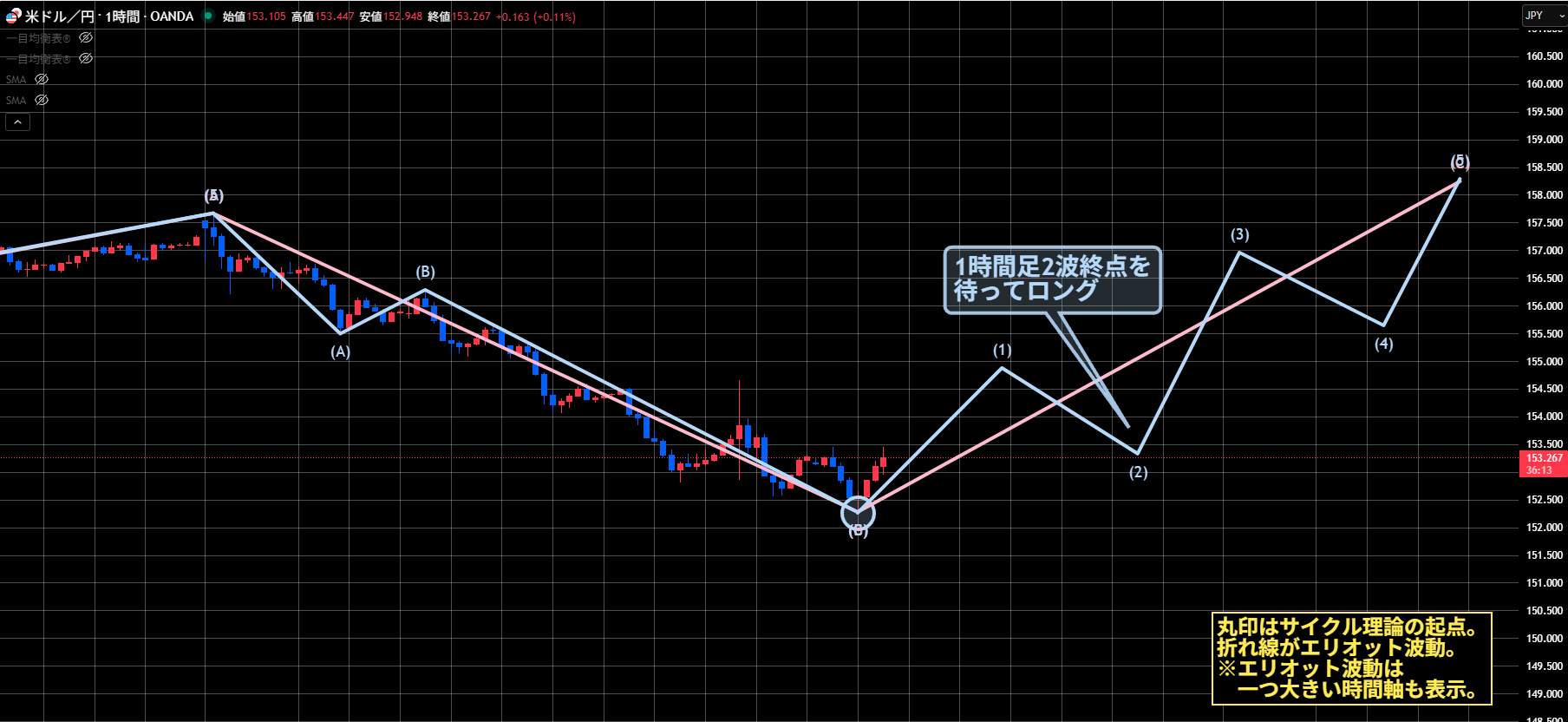 ただし、再度下落してきて152.27を割ってきたら、サイクルも波動も全て継続になります。