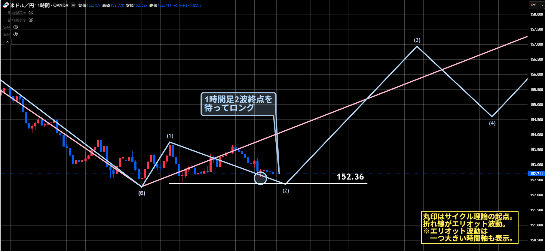 ただし下落してきて152.27を割っても、4Hサイクルは継続でシナリオ断定にはつながりません。
