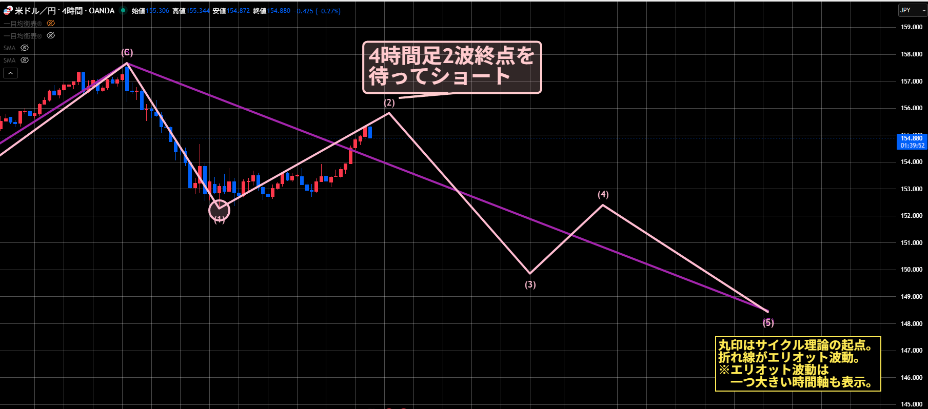 4Hサイクルの天井と4時間足エリオット波動の2波終点を疑う状況なので、次のエントリーポイントは必然的にこれらを待ってショートになります。