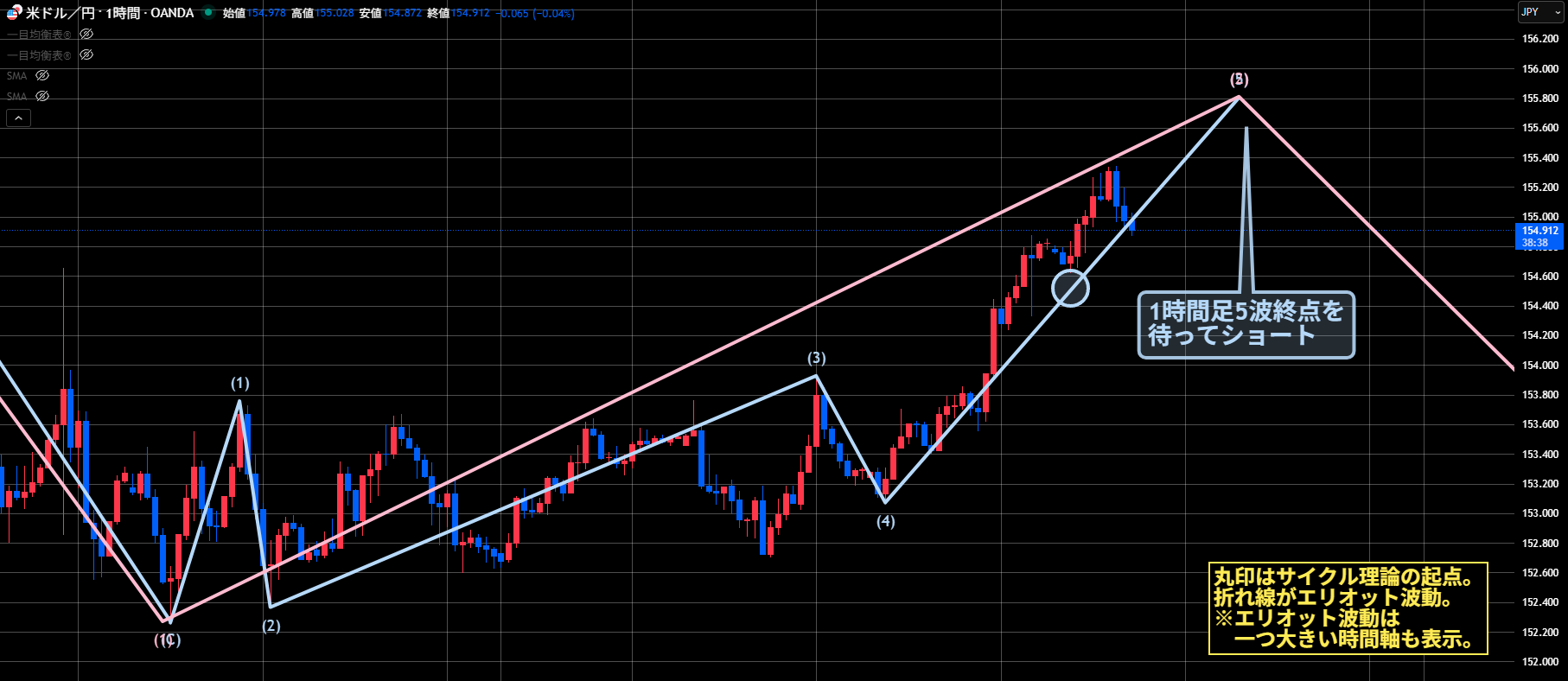 1時間足レベルでも5波終点を待ってショートになります。この5波は4時間足の2波終点と重なるタイミングなので大きなポイントです。