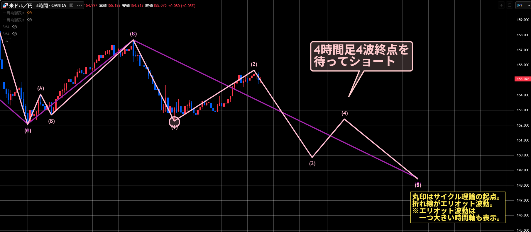 4Hサイクルも金曜日に天井をつけた想定で見ていますが、月曜日は反転しやすい日柄なので、金曜日の遅い時間帯の下落の動きに対する反転があれば、再度高値更新することになる可能性があります。