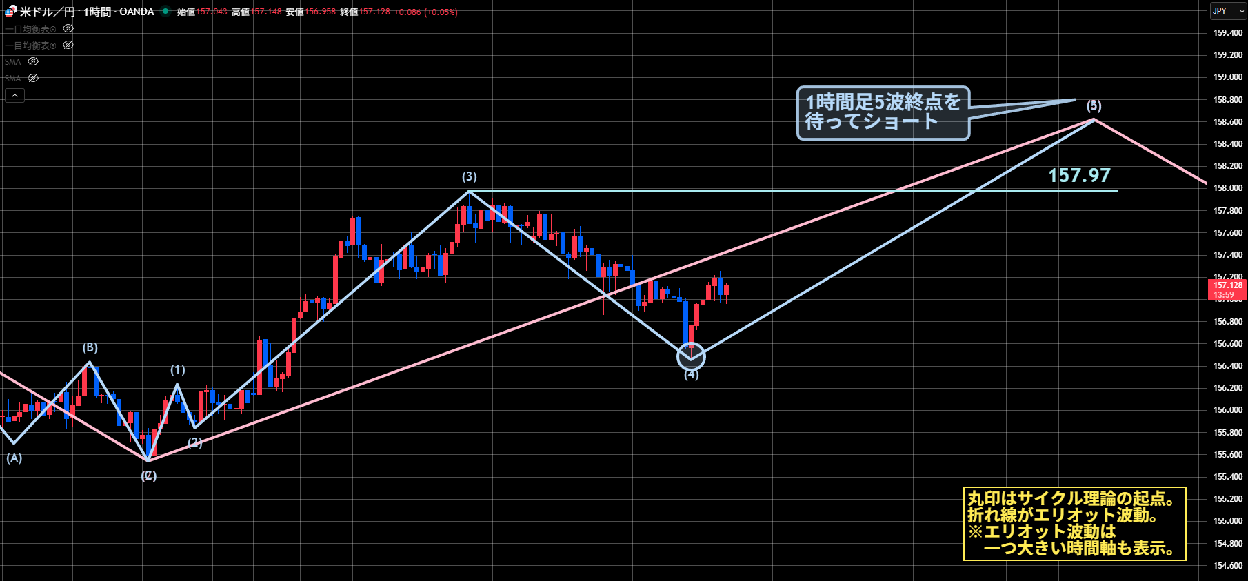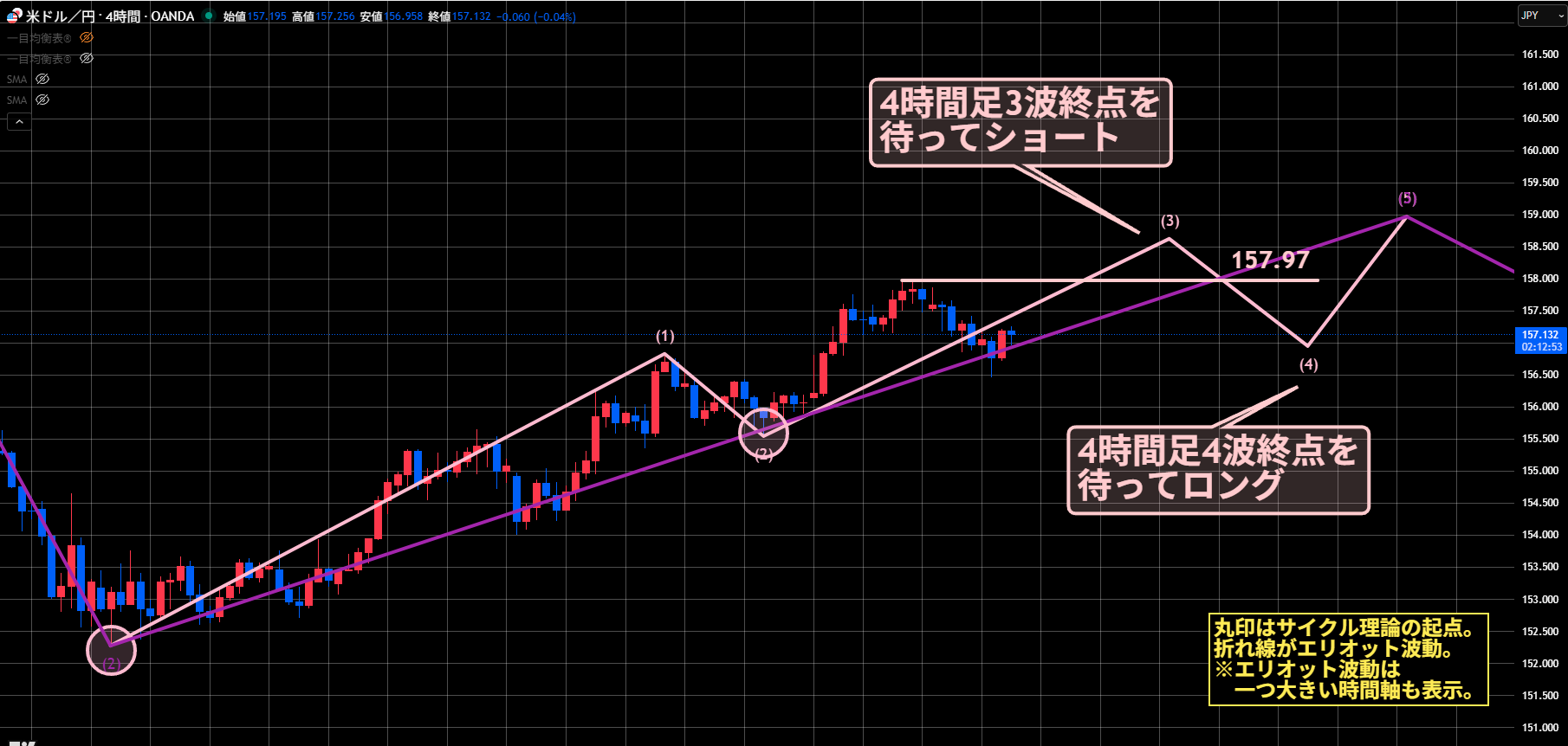 4時間足のエリオット波動3波終点と4Hサイクルの天井第1候補、1時間足のエリオット波動5波終点は、157.97超えが目安になります。