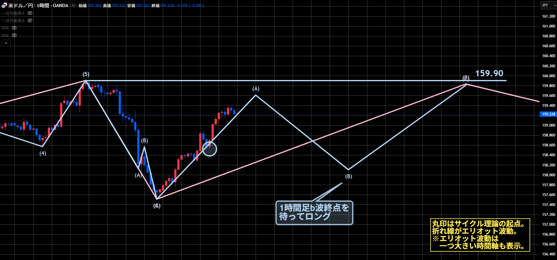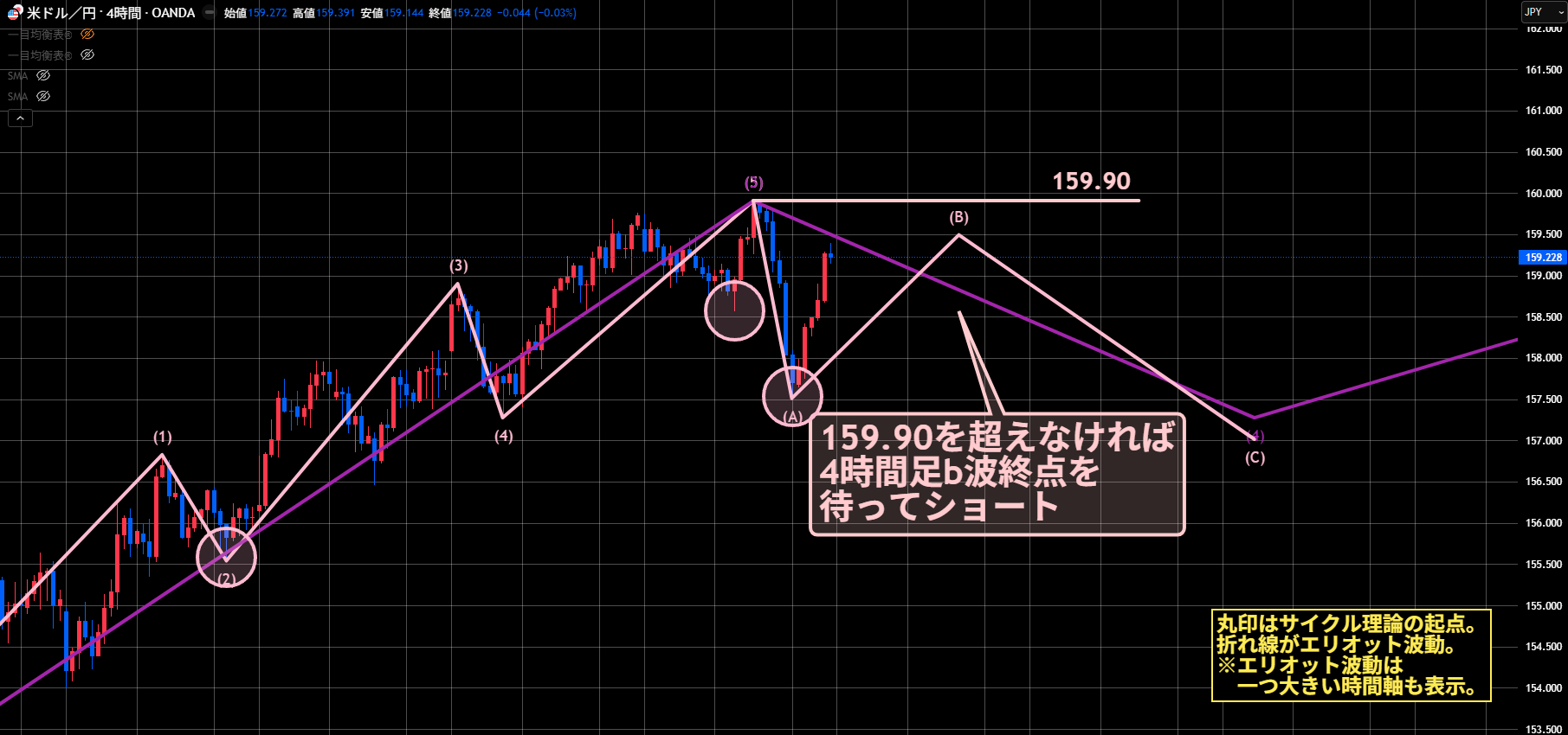 • 1時間足エリオット波動では、b波終点を待ってロング、その後c波終点からショートという流れも考えられますが、全体としては159.90を超えるかどうかが最重要ポイントになります。