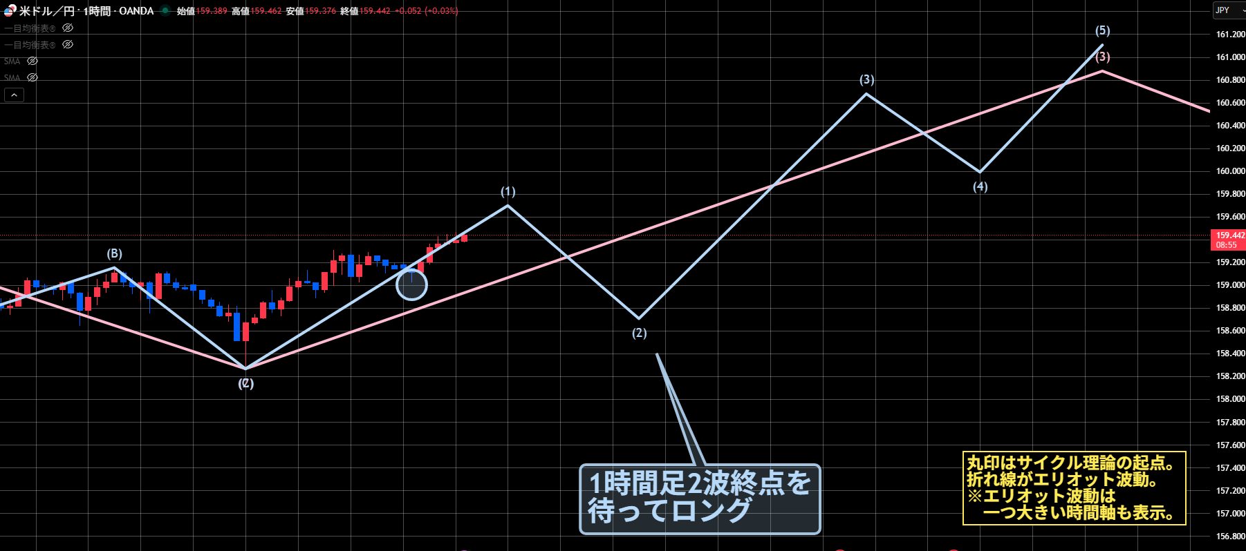 その場合は、1時間足のエリオット波動の2波終点を待ってロングを狙うのが無難です。