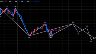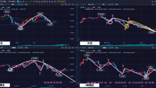 各画像の〇印はサイクル理論の起点、折れ線はエリオット波動になります。エリオット波動は一つ大きい時間軸も表示されています。