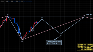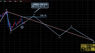 4時間足 <サイクル理論> 24本目・・・起点158.27で直近高値24本目159.93 まだライトトランスレーションかレフトトランスレーションかは判断できません。 <エリオット波動> 1波を形成中で見ています。 ...