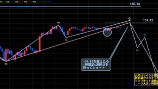 4時間足 <サイクル理論> 73本目・・・起点155.54で直近高値65本目で159.75 現状でライトトランスレーションを形成しています。 <エリオット波動> アップ5波を形成中で見ています。 ...