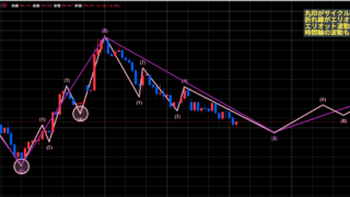 各画像の〇印はサイクル理論の起点、折れ線はエリオット波動になります。エリオット波動は一つ大きい時間軸も表示されています。